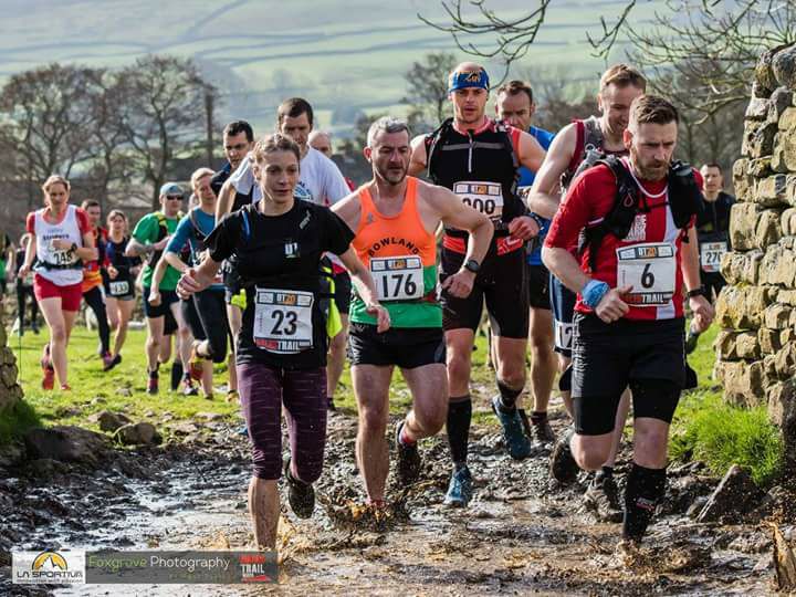 The first mile of this race is a beaut, this year I was determined to go at it from the start and see how I faired, as I was aiming for a race PB. It’s always surprising after the sprint for early positions and the charge through the ‘muddy puddle’ route option… which is my preferred favourite, that the first hill of Fremington Edge takes its toll earlier than expected – it is a dig in and keep moving climb, a run, hike, just keep going effort. The drop into the hush is a favourite section of descending, although this year, my head was down chasing feet and a few of us went down one too soon and had to climb out once we realised that we had got it wrong… losing time gained and a good number of places to boot.  Coming down from Fremington Edge there are two bridges to cross, a stream then the river and even a graveyard to run through before you cross the road and start the ascent to the top of Calver- which is of varying terrain.